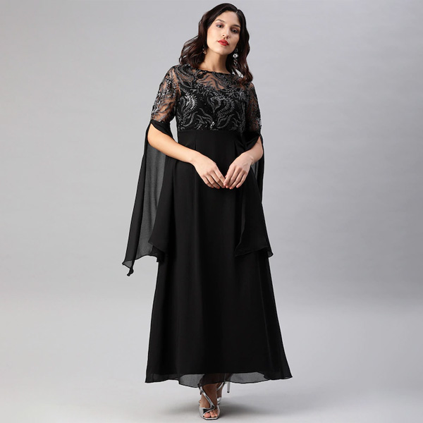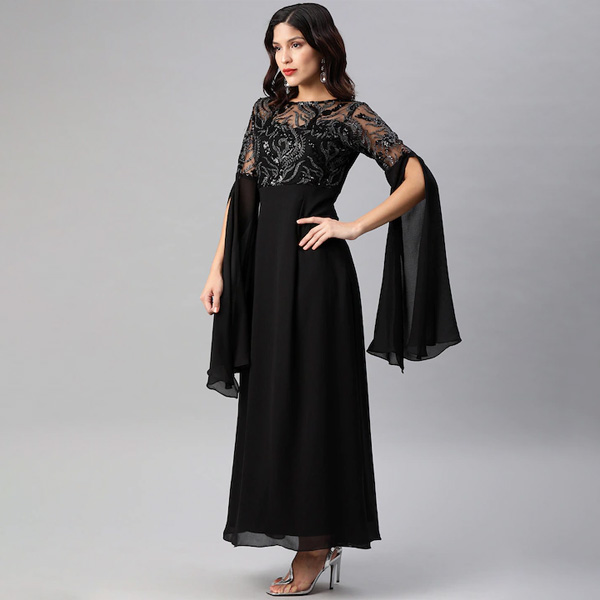 Black solid woven fit and flare dress, has a round neck, long sleeves, zip closure, an attached lining, and flared hem