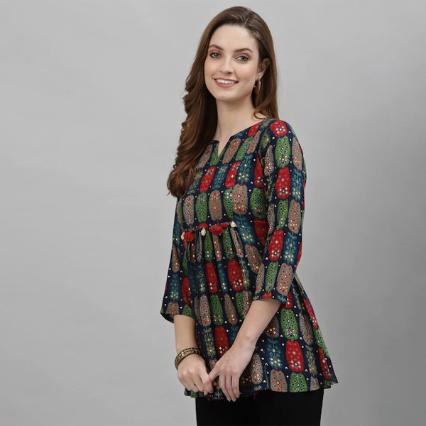 Blue and green printed tunic ,has a round neck, three-quarter sleeves, gathers detail