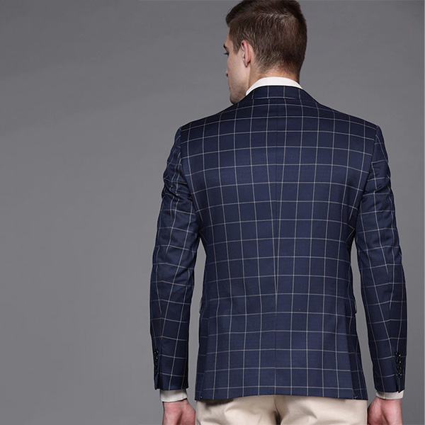 Navy Blue & Beige checked smart casual blazer, has a notched lapel, single breasted with button closures, long sleeves, 2 flap mock pockets and 1 welt pocket, double vented hem, an attached lining with two in-built pockets