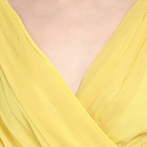 Yellow solid woven maxi dress, has a V-neck, long sleeves, button closure closure, an attached lining, flared hem Comes with golden belt.