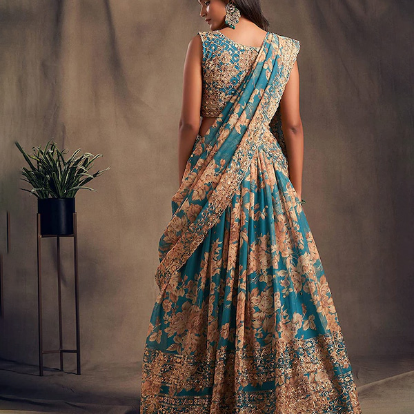 Blue & Beige Printed Semi-Stitched Lehenga & Unstitched Blouse With Dupatta